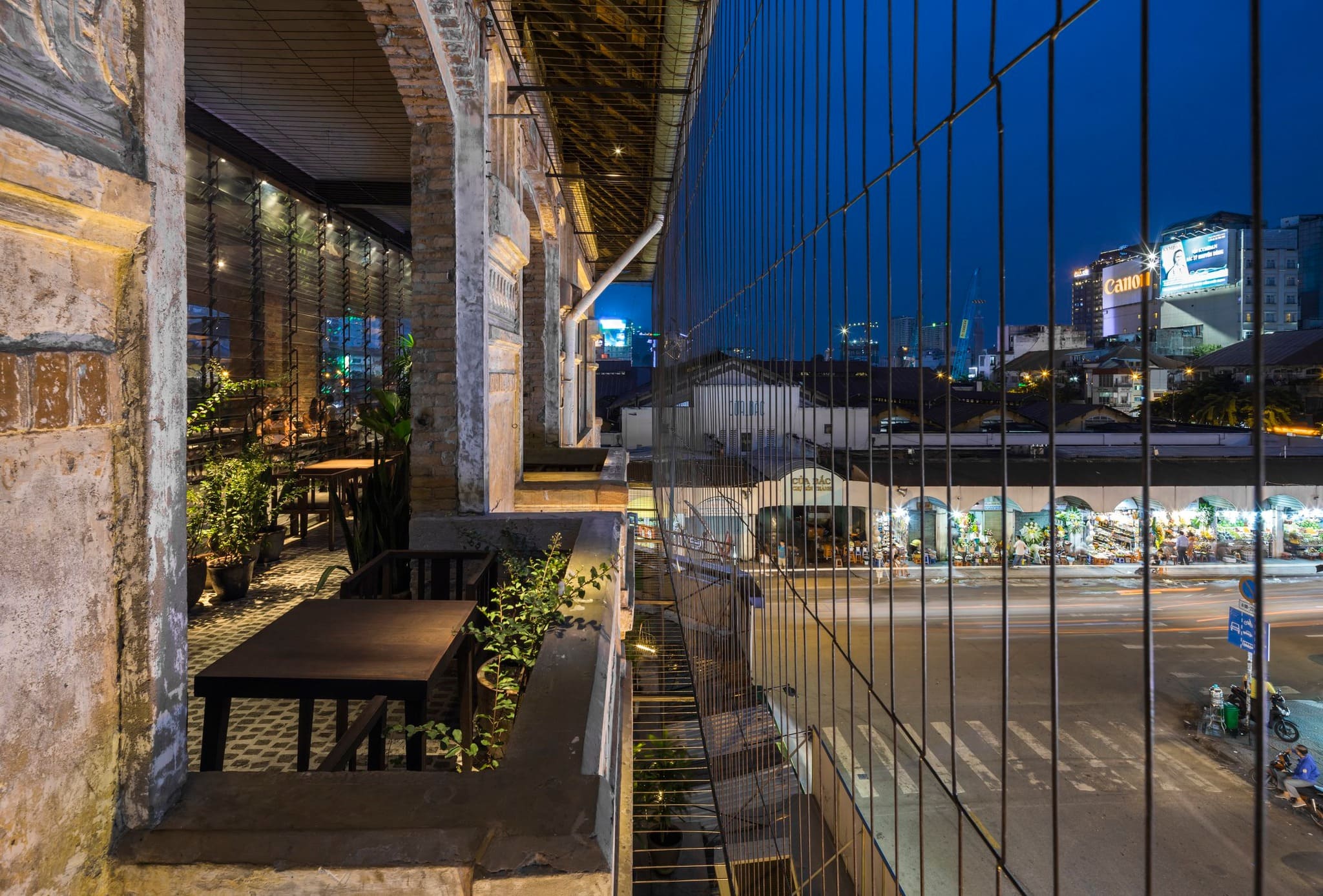 Outdoor balcony seating at Pizza 4P’s Ben Thanh, overlooking Ben Thanh Market and Saigon’s buzzing night streets
