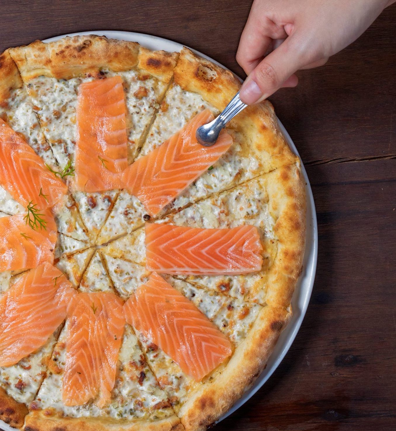 We now can eat raw fish on pizza? Yes! This one’s not your usual pizza. It starts in Italy with hot, crisp crust and creamy ricotta and ends in Japan with a plate of fresh, buttery salmon sashimi on the side.