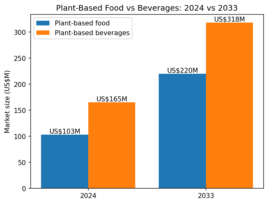Vietnam Plant-Based Market: Food vs Beverages (2024 vs 2033)